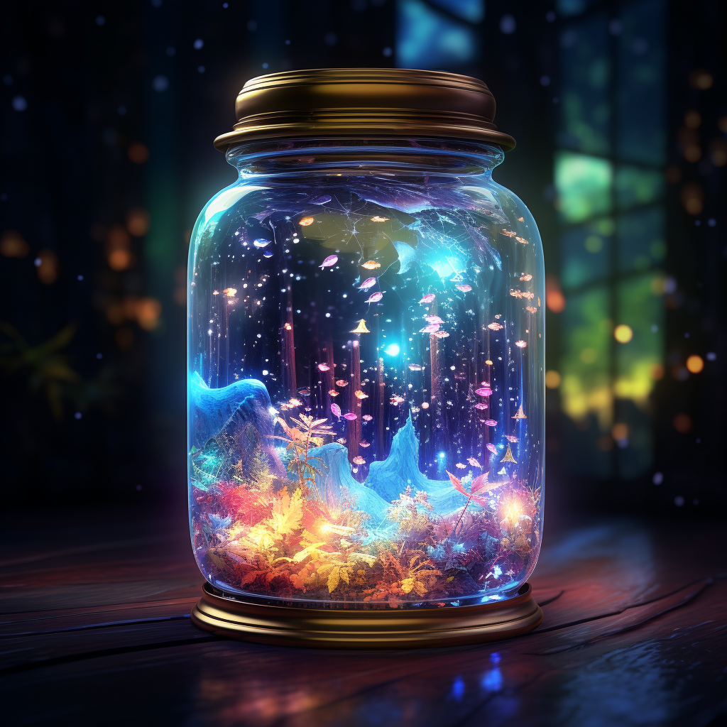 a glass jar with a magical world inside of it, a 3D render, by Volkan Baga, fantasy art, radiate connection, thomas kinkade and paul lehr, detailed, hidden portal, magical potions, bubbles of the impossible, shining lamps
