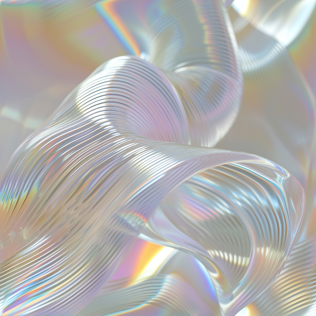 refraction of light through glass organic forms, close-up ribbed plastic object, depth of field, pastel, rainbow colored border, in the style of ethereal light effects, monochromatic white figures, minimalist, shimmering metallics, gray background --tile --v 6