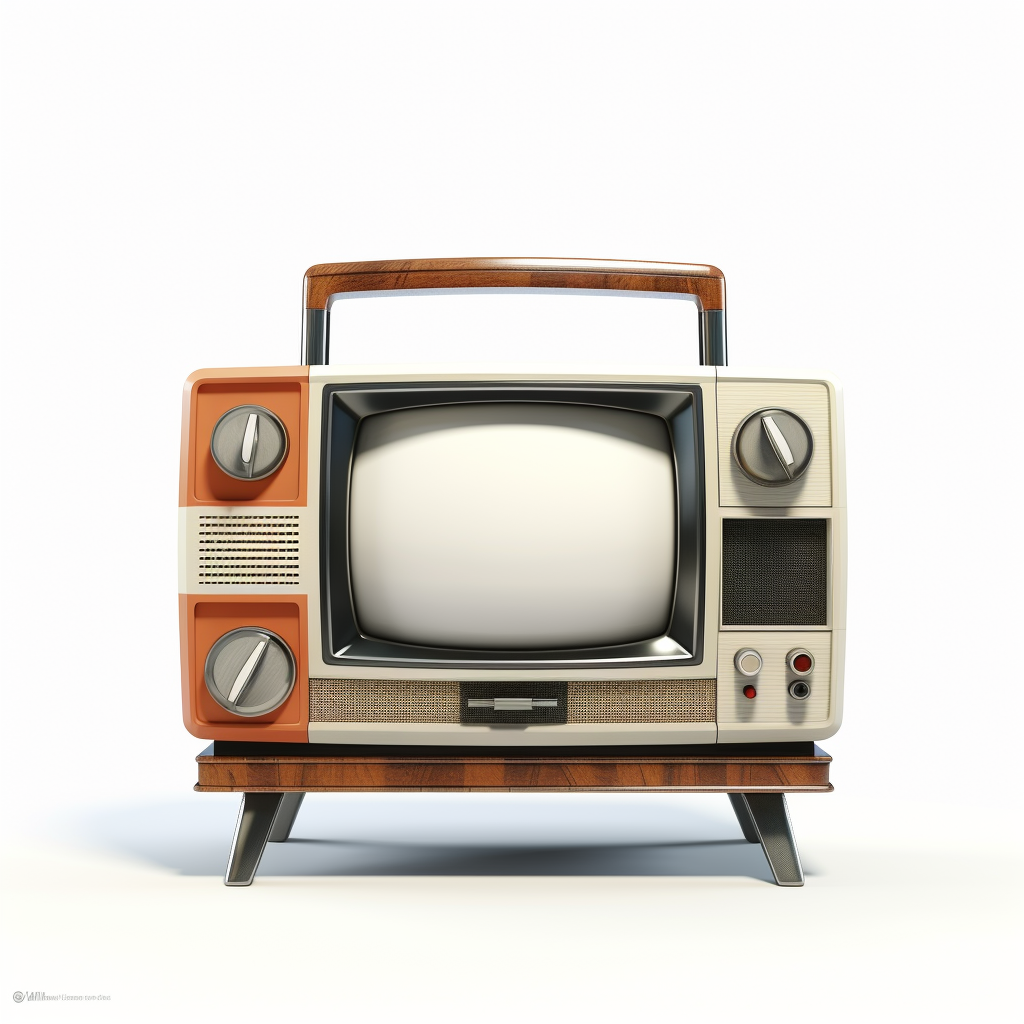 retro tv station, on white background, high-angle photo, soft light, 3d render, wide angle shooting, raw
