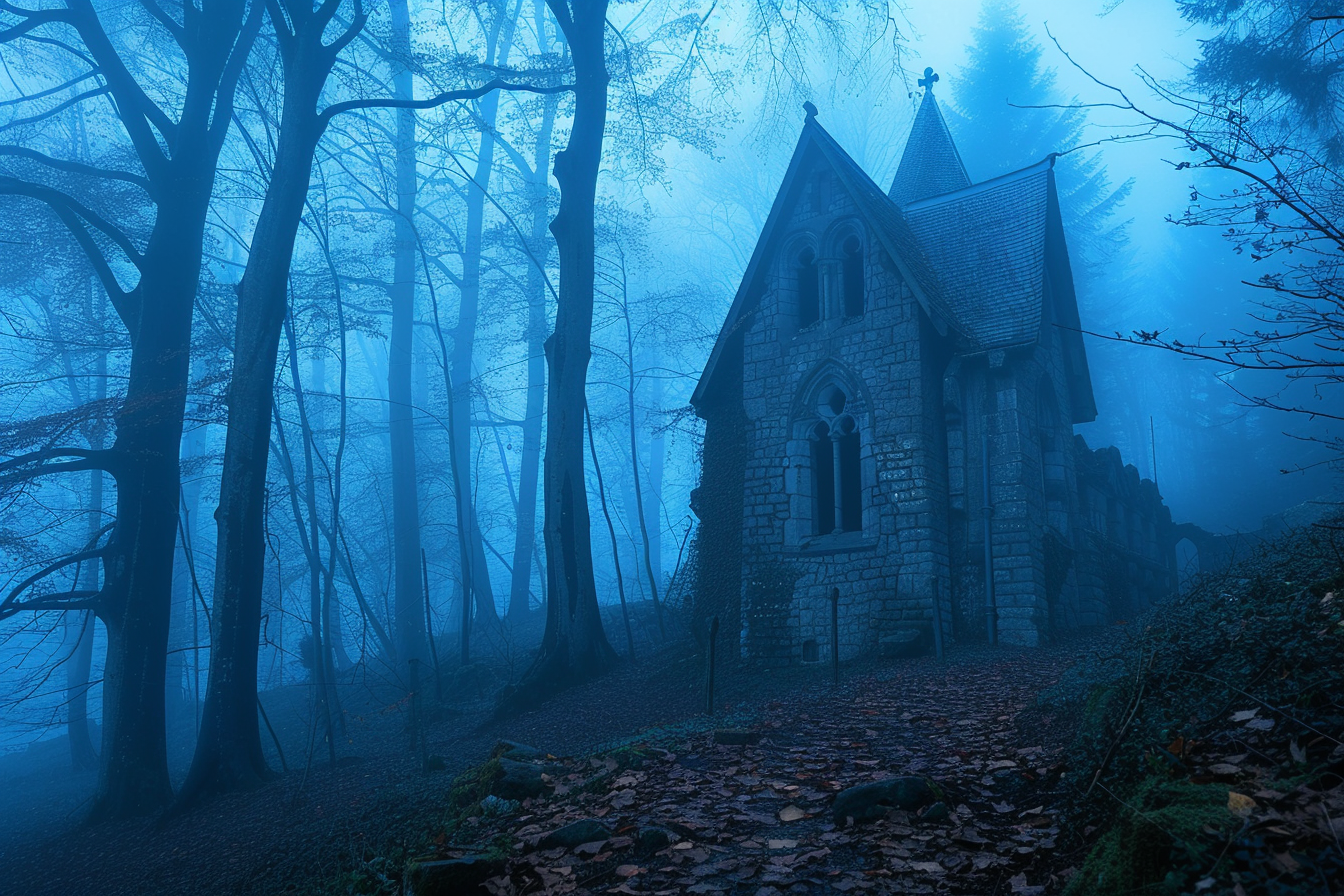 the haunted house in the forest in 'Foggy Sanctuary', standing contemplatively in a blue fog-filled alcove, an ethereal, otherworldly grey veil enveloping the scene in tranquility and wonder --ar 3:2 --v 6.0 --style raw