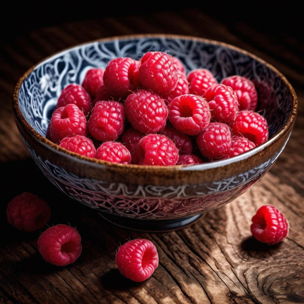 closeup photograph raspberries in a ceramic japanese bowl on a beautiful wood table, intricate details, hyperdetailed photograph, dark contrast, award winning composition, dark shadows, 8k resolution, food photography