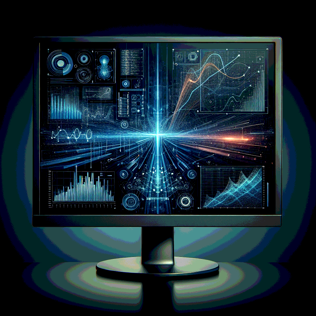 back angle view of a monitor displaying advanced machine learning algorithms and data visualization. The screen glows with dark and navy blue hues, accented with grey and orange lines and graphs, depicting complex computational processes; modern, digital, superb quality, black background