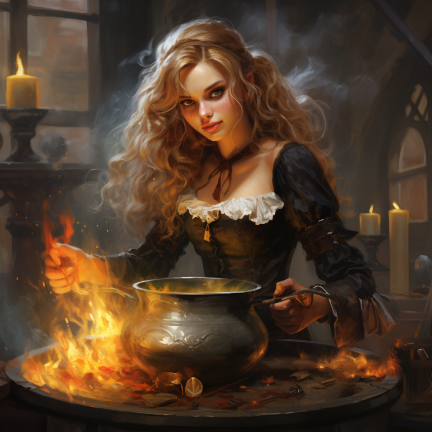 young witch preparing a spell in a cauldron, jovial tone, fantasy illustration, hyperdetailed