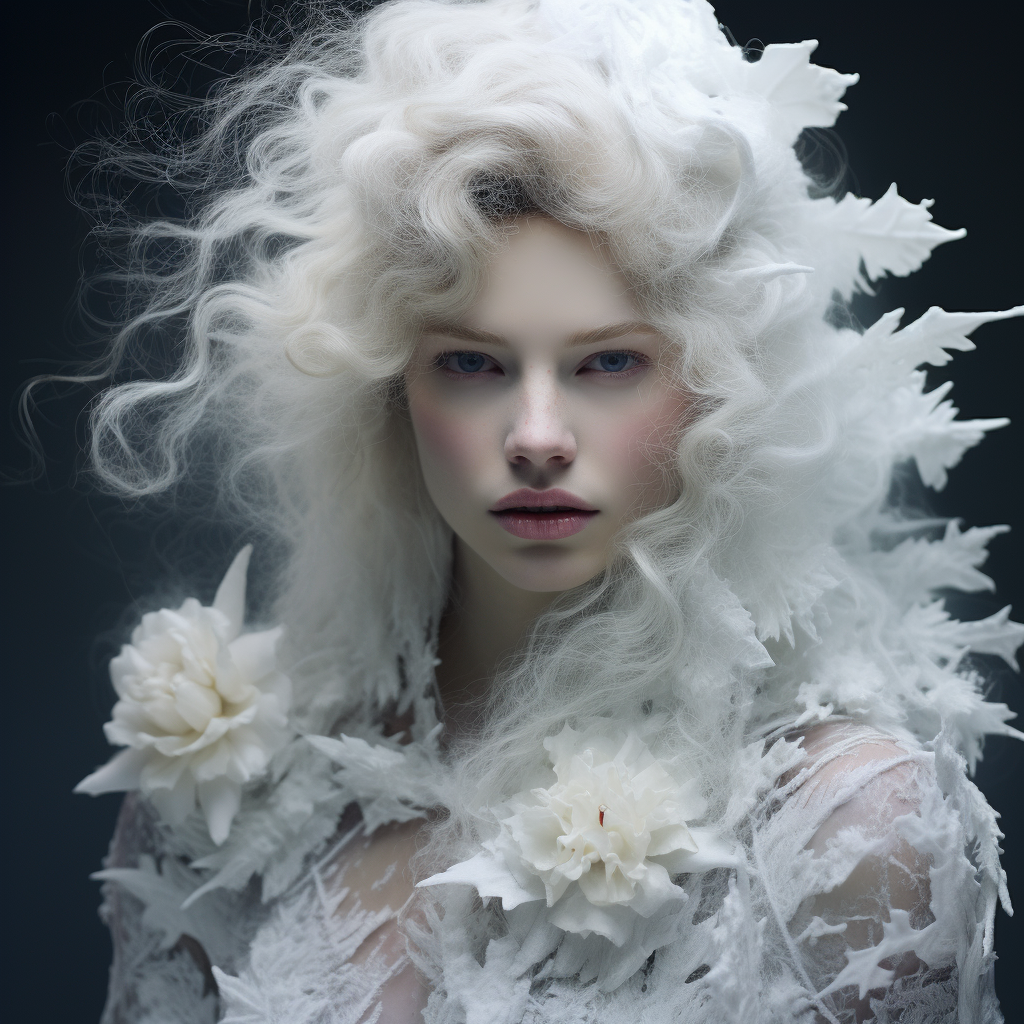 close up portrait of a woman with frosted skin, rime ice, crystallized, elegant botany, intricate hair and flowers frozen, detailed, hauntingly beautiful, volumetric lighting