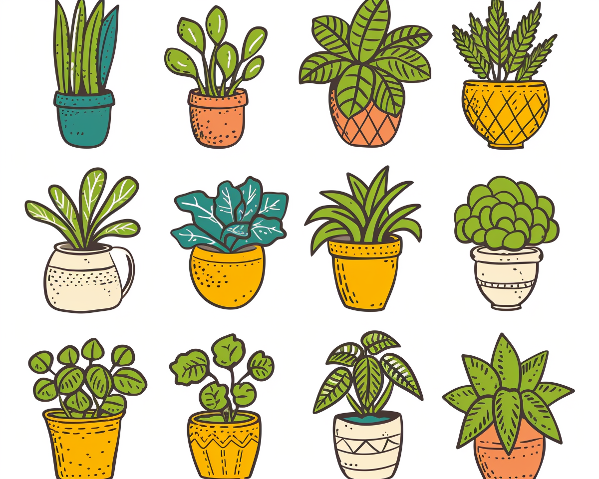a set of potted plant clip art doodles --v 6 --ar 5:4