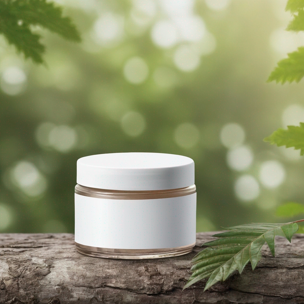 a mockup for a cosmetic jar with white lid in a natural background, blank label