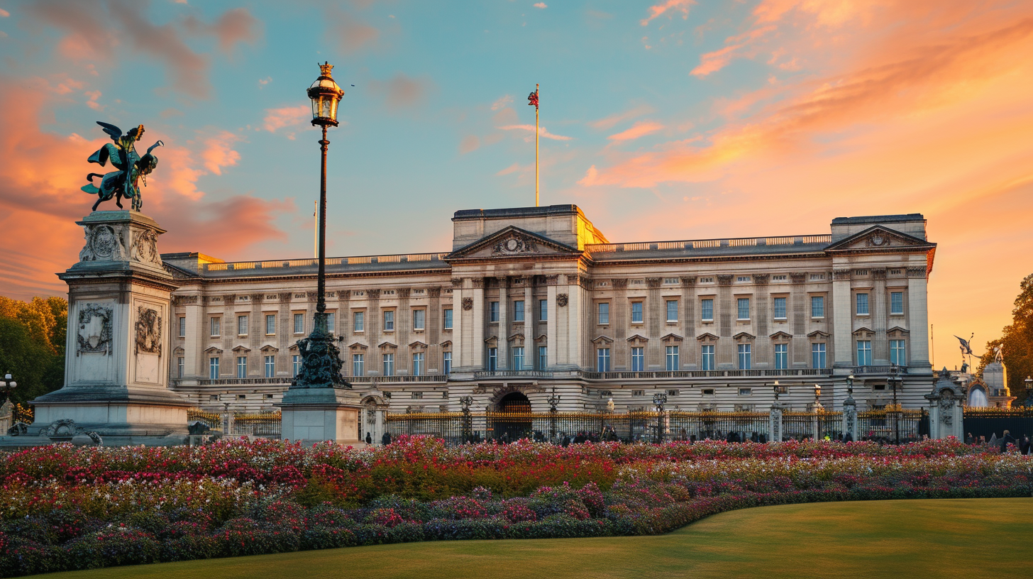 a stock photo of Buckingham Palace, London, royal residence, centerpiece, architectural marvel, postcard-quality, Rule of Thirds, crystal clear view, Getty Images --ar 16:9 --v 6.0
