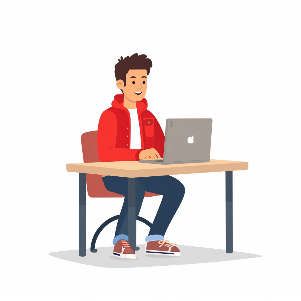 simple flat vector illustration of a young man sitting at desk with a laptop, isolated on a white background --no shading --v 6 --s 0