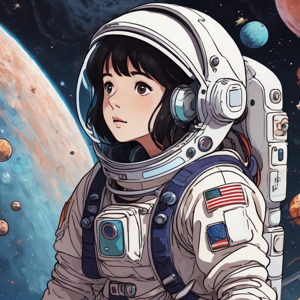 a girl astronaut exploring the cosmos, floating among planets and stars, high quality detail, , anime screencap, studio ghibli style, illustration, high contrast, masterpiece, best quality