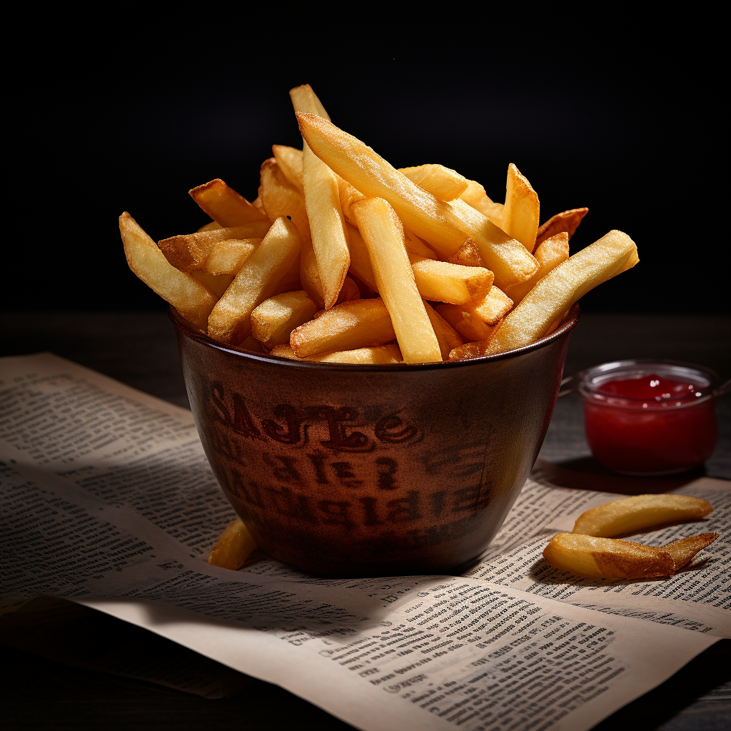 a photo of french fries in a small brown pot, mouthwatering, photorealistic, culinary book style
