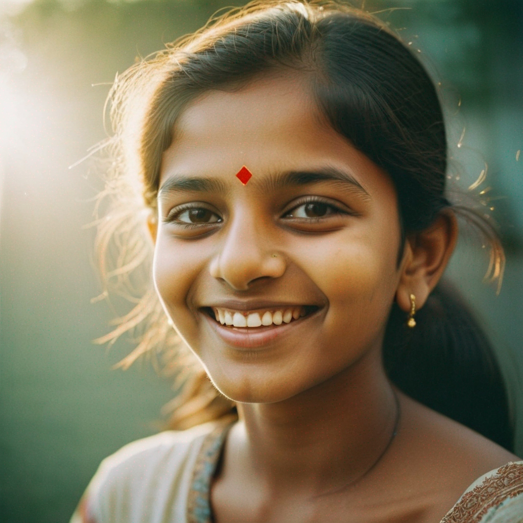 happy indian girl, portrait photography, beautiful, morning sunlight, smooth light, shot on kodak portra 200, film grain, nostalgic mood