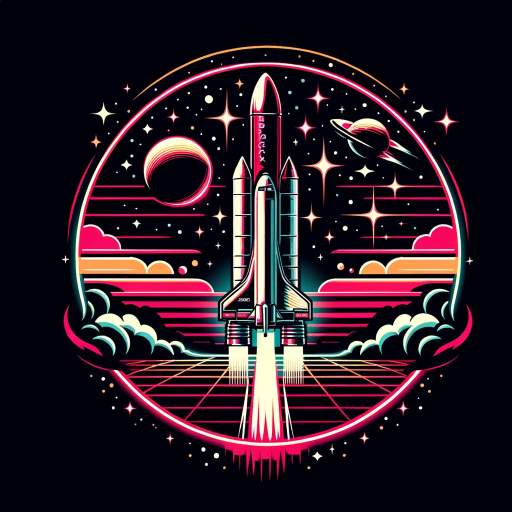 retro sci-fi rocket in outer space, tshirt design, vector artwork, neon theme, in a circle, white background, glowing