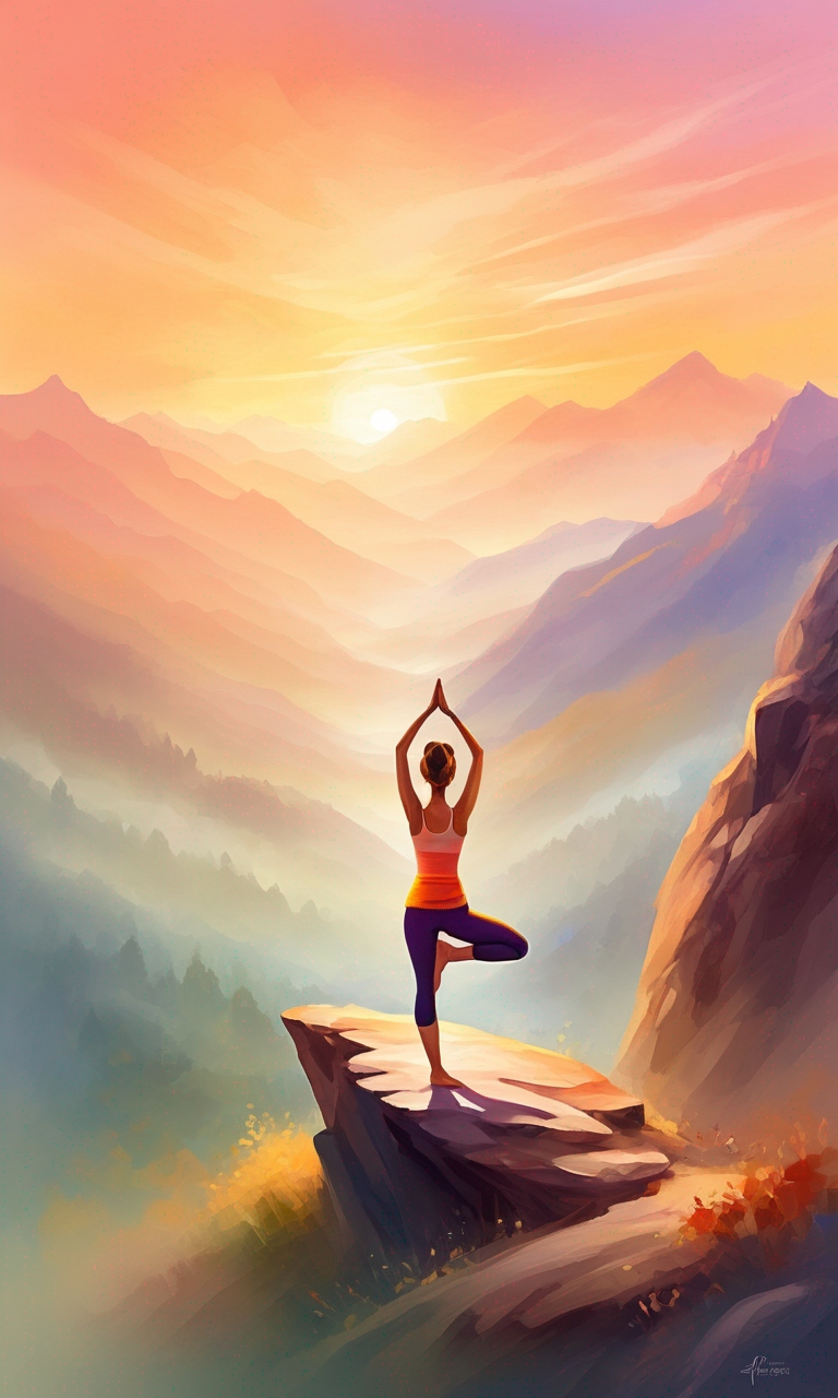 uplifting wellness-inspired illustration showing a serene yoga session at sunrise on a misty mountain peak, warm color palette, tranquil, soft focus, smooth gradients, digital painting, highly detailed, calming, positive energy flow, nature elements, mindfulness theme, art by Leonid Afremov, DeviantArt
