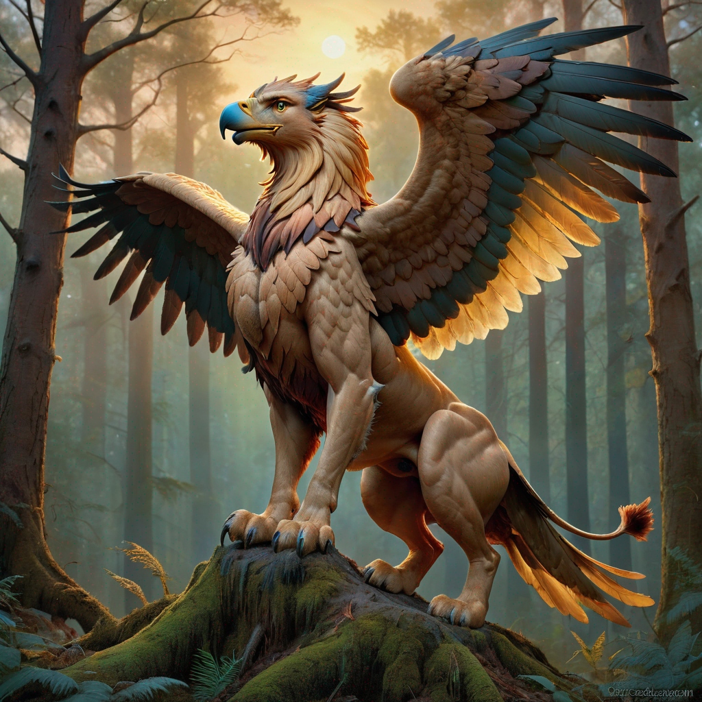 a highly detailed, full body depiction of a griffin, showcasing a mix of lion’s body, eagle’s head and wings in a dramatic forest setting under a warm evening sky, smooth, vibrant, digital painting, matte, sharp focus, by artgerm, greg rutkowski and zdislav beksinski, with a hint of magical realism, exquisite detailing, including feathers, fur, and talons, where the griffin is poised to leap into flight, trending on Artstation, saving the image in 4K UHD quality