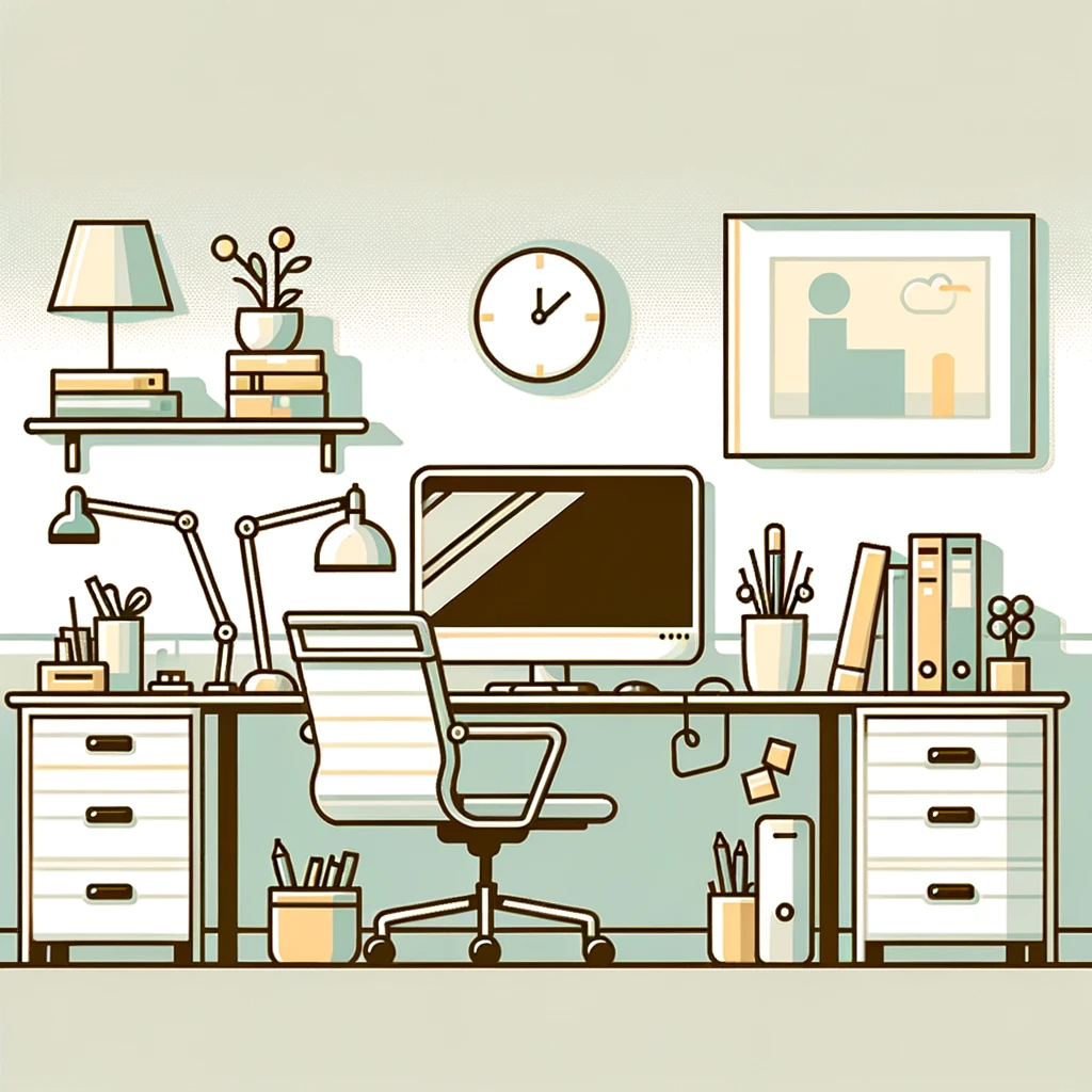 flat vector illustration of an office, clear off background, minimalistic, clean lines, adobe illustrator