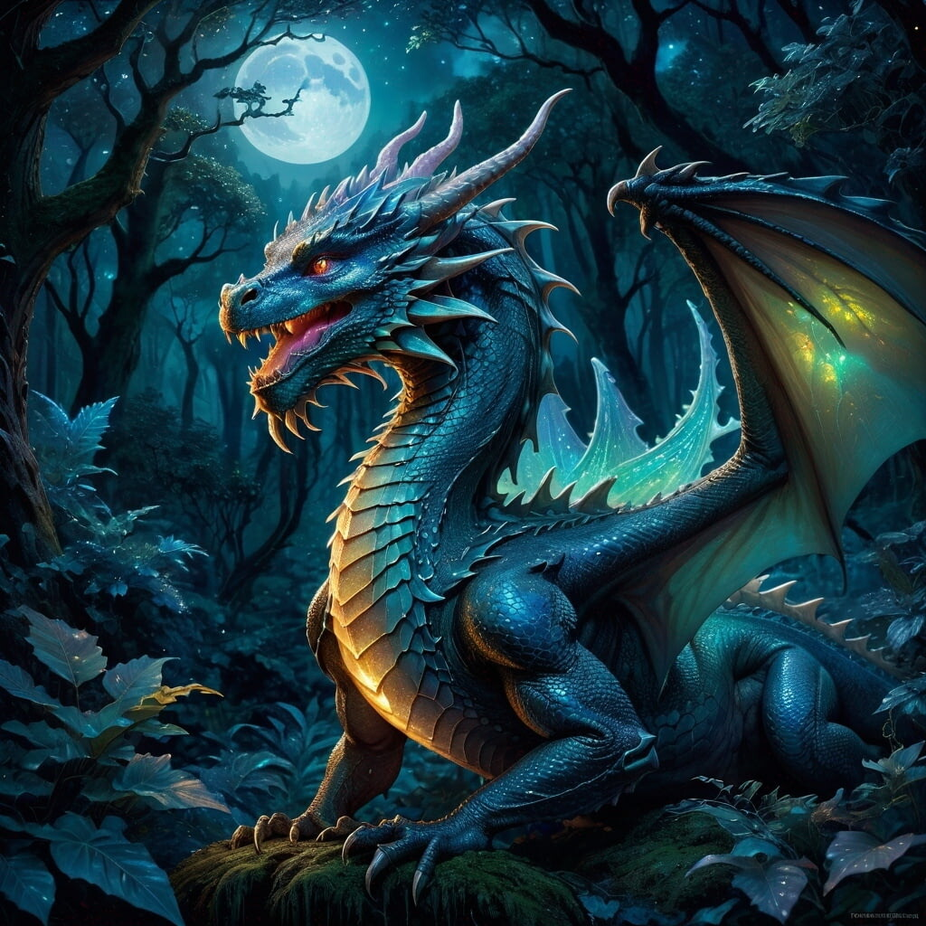 a fantasy illustration of a majestic, ancient dragon with an opalescent scales, amidst glowing enchanted forest, illuminated by magical moonlight, intricate, highly detailed, rich textures, mystical ambiance, digital painting, vivid colors, ethereal, artstation trending, detailed matte background, sharp focus, smooth, majestic, by Todd Lockwood, Donato Giancola, Frank Frazetta, and Brom