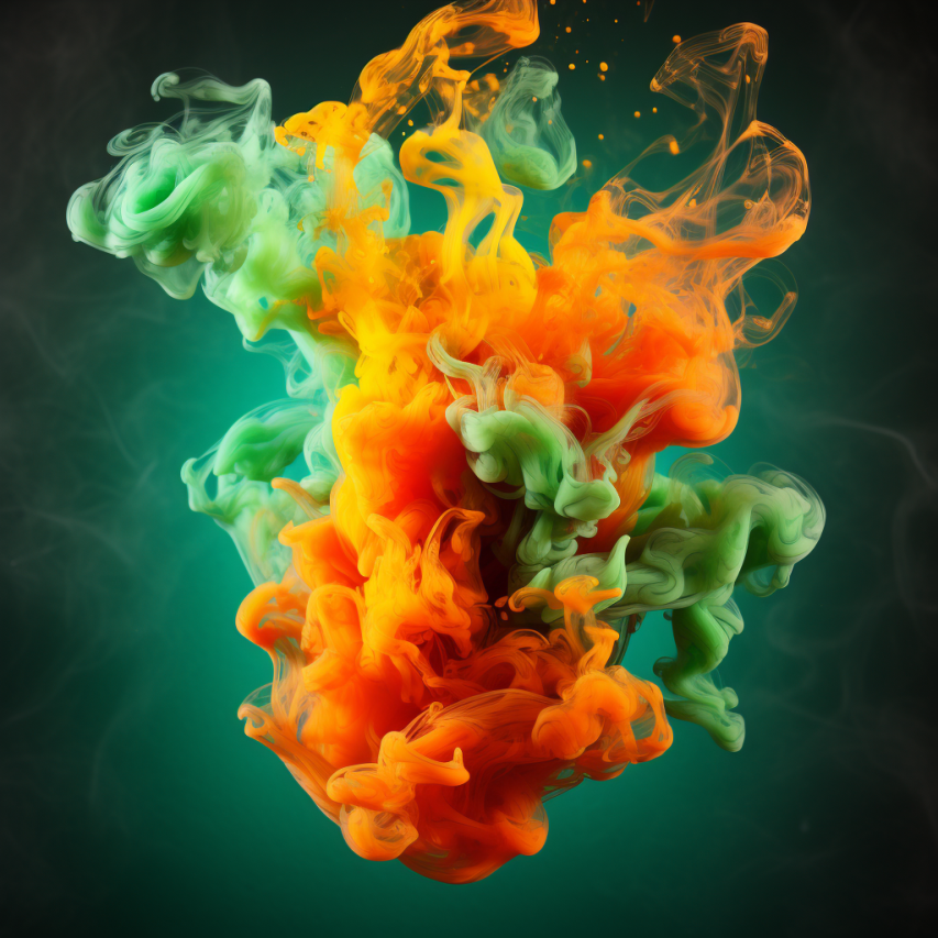 colorful smoke with the orange and green, in the style of hyper-realistic water, zbrush, bold chromaticity