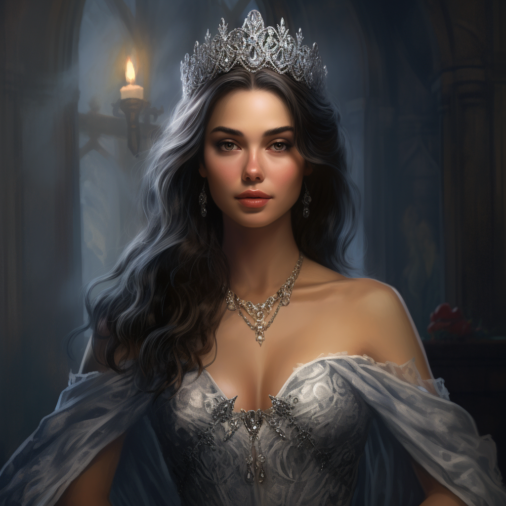 a gorgeous queen slightly smiling, stunning dress, portrait, detailed, silver diamond tiara, photorealistic
