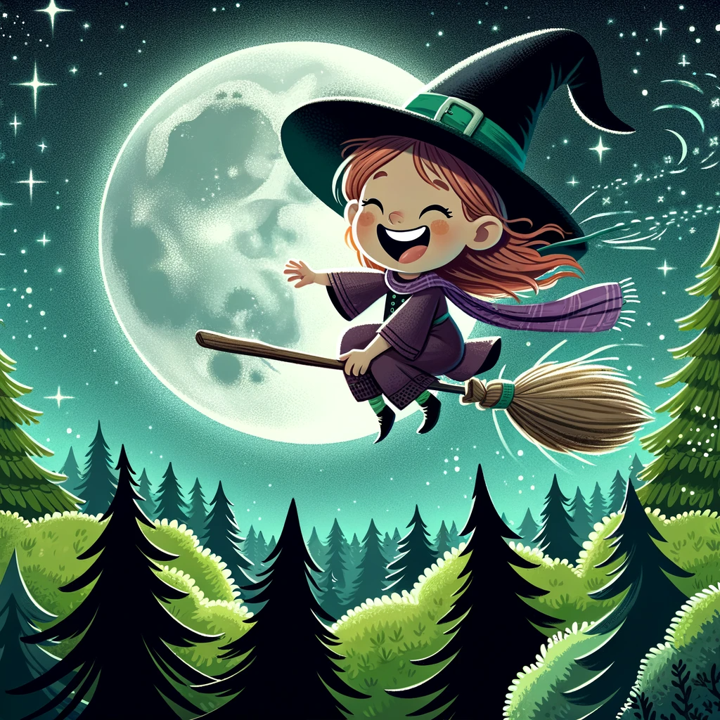 children book illustration of a witch flying over a forest and laughing, a big moon in the sky, starry night, 2d illustration