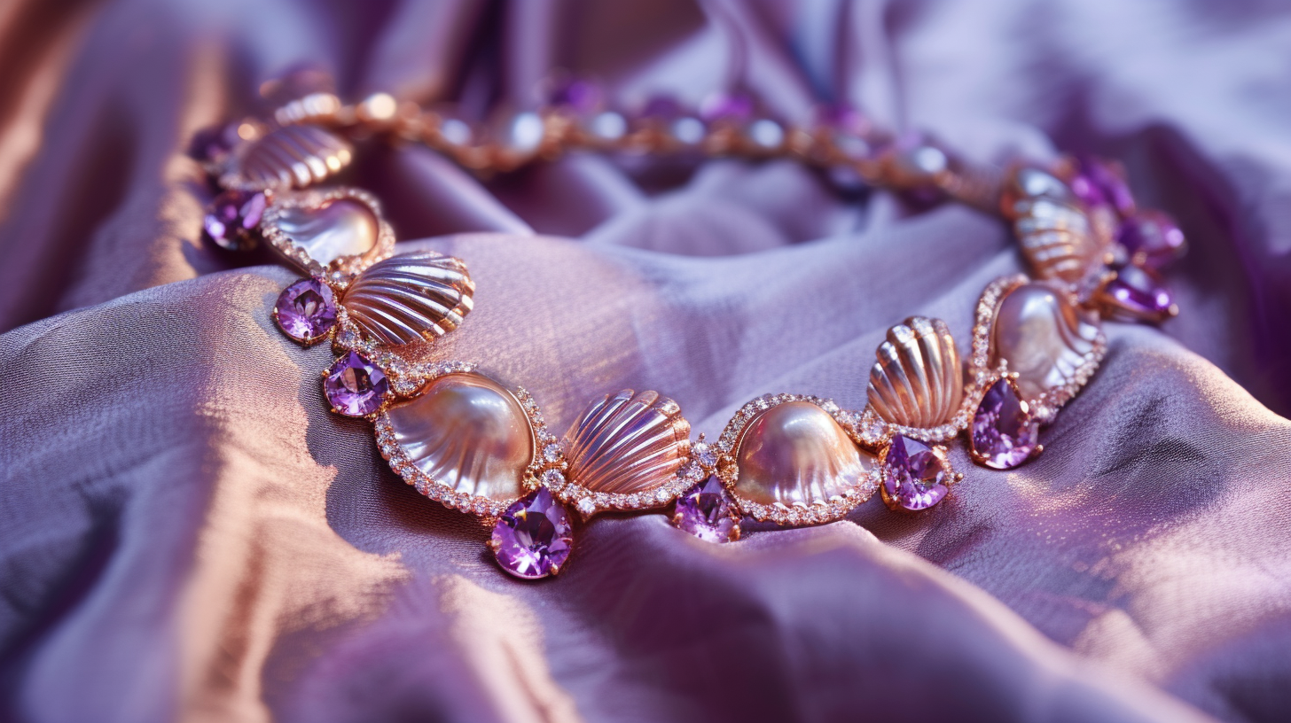 a closeup photo of a gorgeous modern shell necklace with pink amethyst stones, displayed on a velvet wavy ombre color background --ar 16:9 --v 6.0