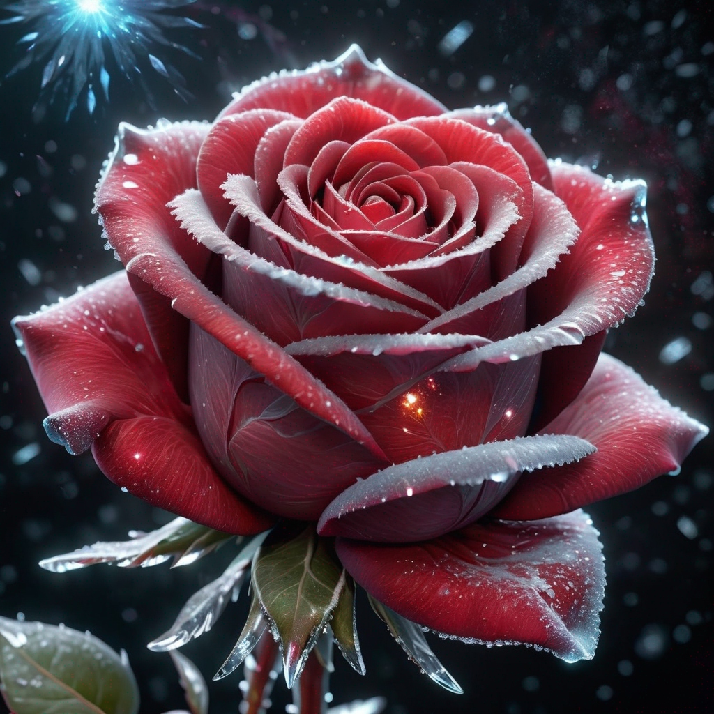 a frozen cosmic rose, the petals glitter with a crystalline shimmer, swirling nebulas, 8k unreal engine photorealism, ethereal lighting, red, nighttime, darkness, surreal art