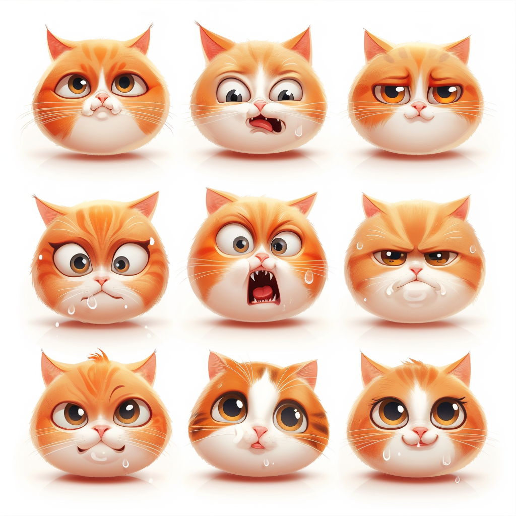 a cat as emoji icons with different emotions, expression sheet, on white background, high-angle, soft light, 2d cartoon --v 6